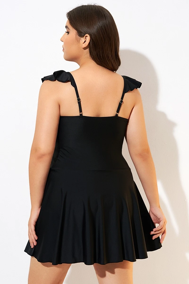 Black Twist Front Sweetheart Neckline Ruffle Swimdress