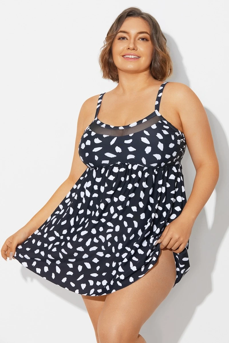 White Polka Dots Print Mesh Panel Swimdress -Bikini Bliss Shop b desd120001 2